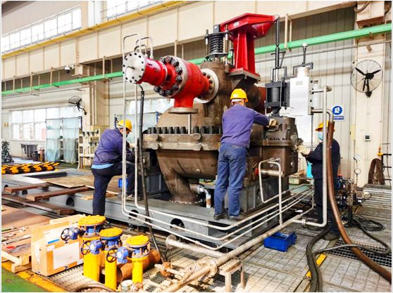 该机组是用户炼油产品调整及油品质量升级改造项目的核心设备,装置的节能改造对用户效益的提升起着关键作用。由于项目整体改造周期短,为确保机组按期交货,东升国际汽轮机团队从前期产品的技术准备,以及零部件加工制造、配套件协作采购等各个环节都做到了精心策划,科学组织,使得该机组生产得以顺利推进。然而突如其来的新冠病毒疫情严重影响了既定计划的执行,本着“用户永远是对的”和“全心全意为用户服务,全力满足用户需求”的工作理念,项目团队按照集团公司党委提出的“疫情防控和生产履约两手抓”总体要求,在确保防疫各项工作到位的前提下,积极组织团队成员参与到复工生产中。大家加班加点,协同作战,攻坚克难,复工仅一周时间,机组便完成了装配工序,也创下了该类型汽轮机组装的最短周期。